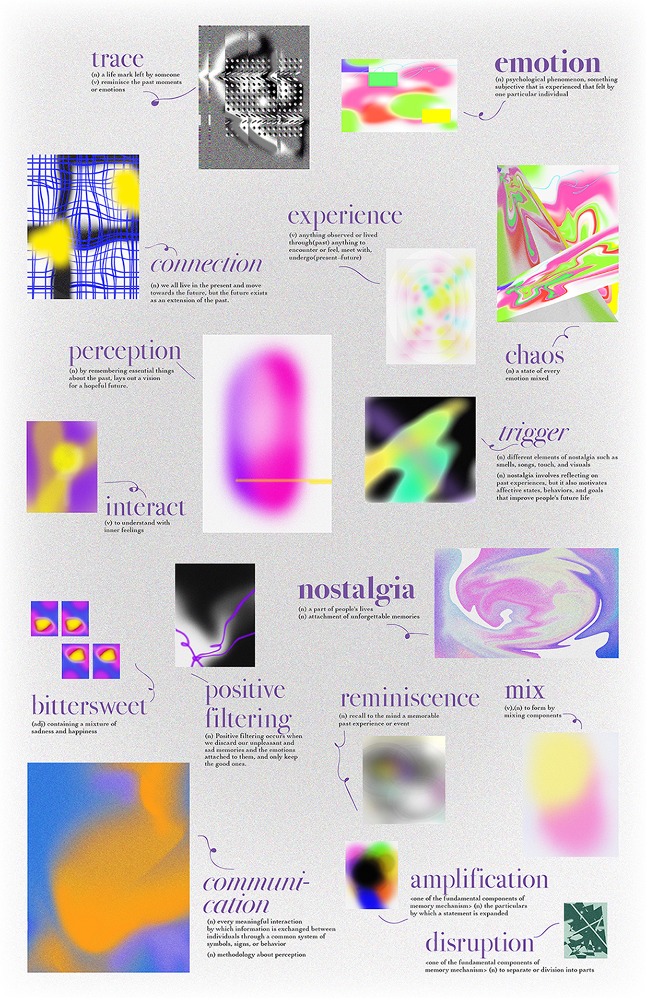 I created sixteen abstract digital paintings as a communication tool to use our feelings to become honest or build strong relationships. The paintings respond to a range of words: Emotions, Interact, Chaos, Trigger, Nostalgia, Reminiscence, Trace, Experience, Connection, Perception, Amplification, Disruption, Positive filtering, Mix, Bittersweet, and Communication. From here, I can apply how these visualizations influence how we can utilize “Nostalgia” as a positive filter toward a desirable future scenario. This design experiment influences my personal definition of nostalgia as positive psychology with suggestive potential.