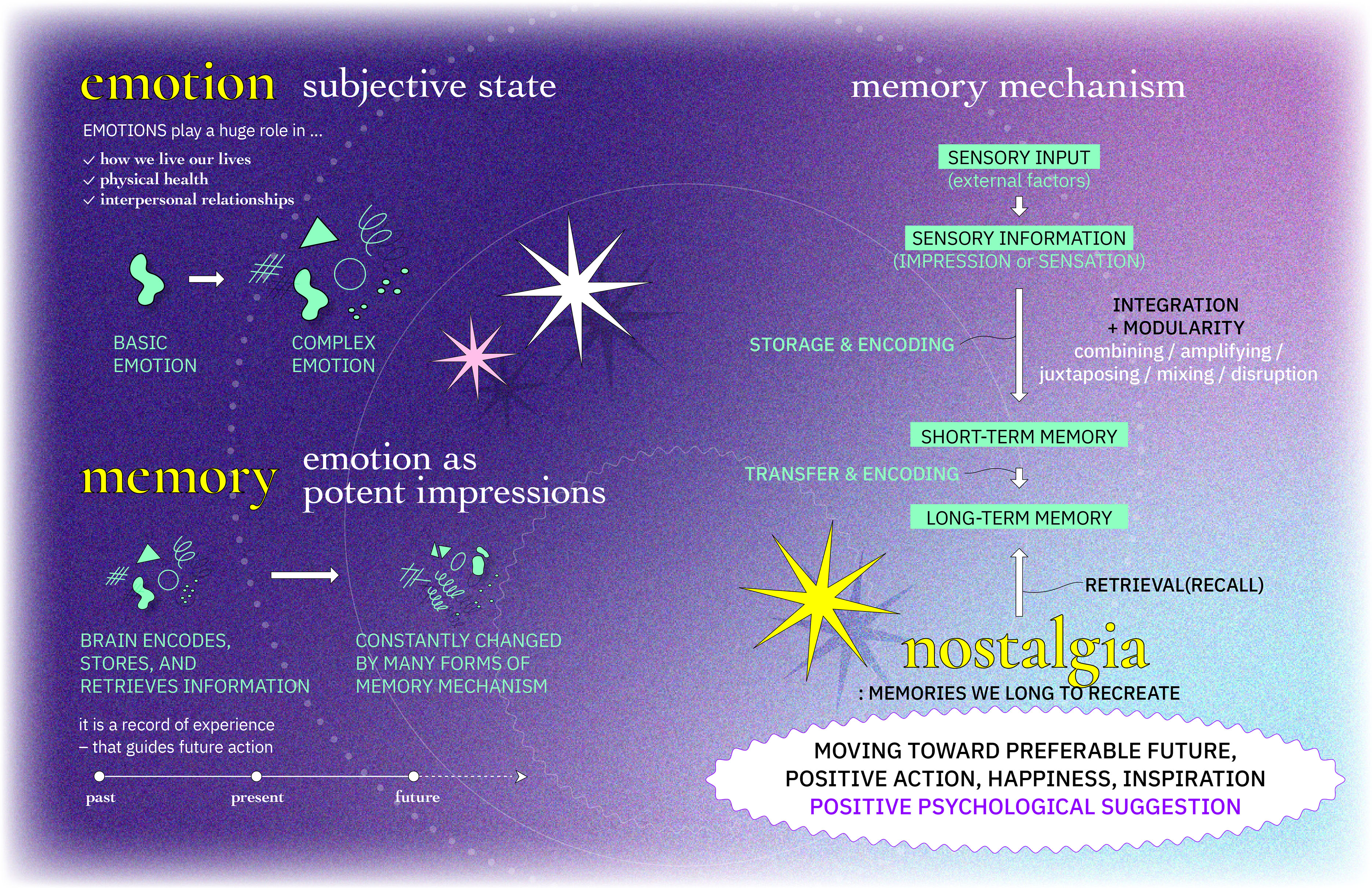 This Mapping Nostalgia shows the relationship between emotions and memory, and nostalgia. An emotion is a psychological phenomenon, a subjective state of mind derived from one’s circumstance, mood, or relationships with others. Our emotions are complex, so we can’t beg them into a few categories. Memories imply emotions from the past. Whether it belongs Positive or negative, memories influence us.