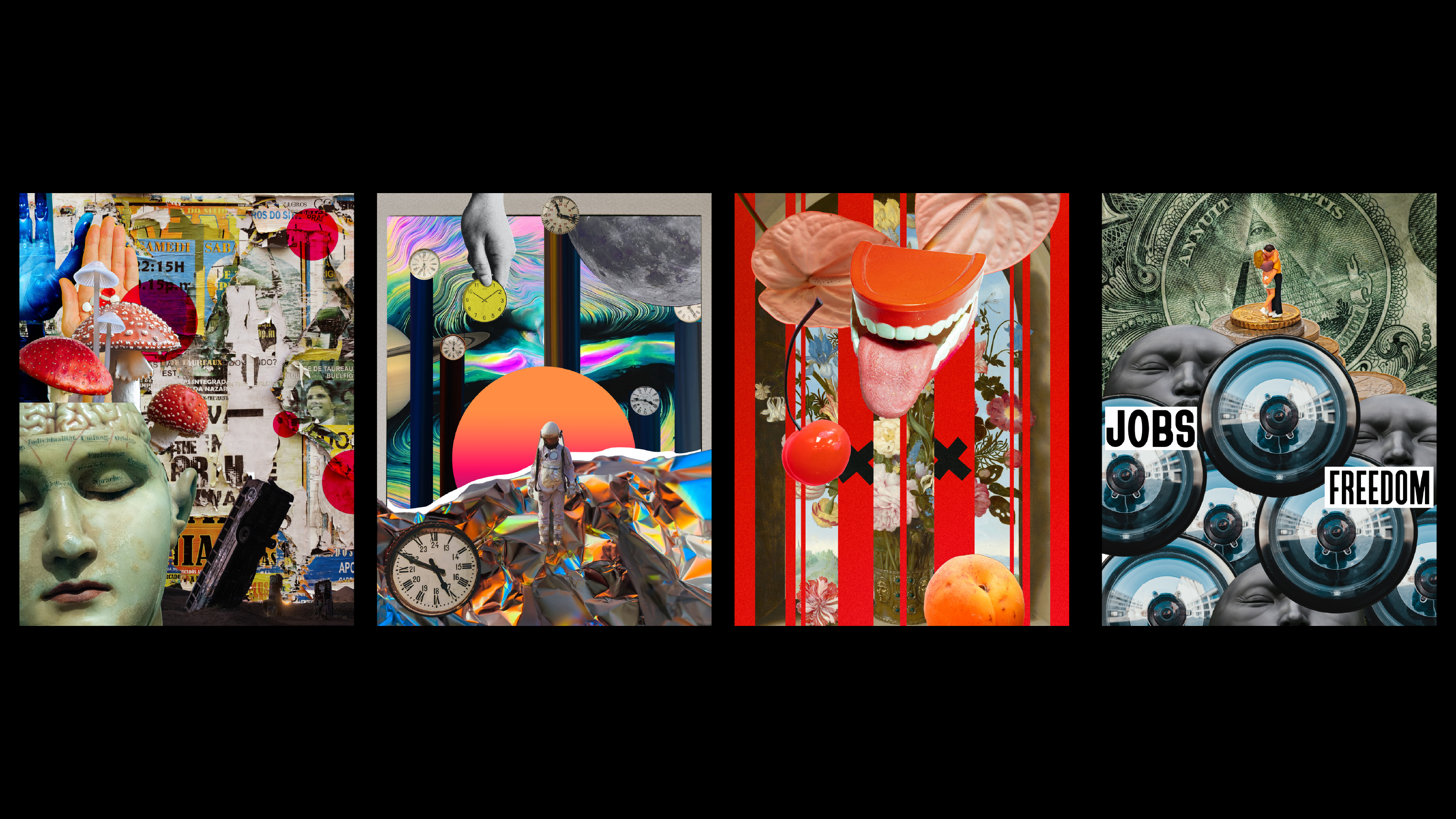 These four collages are a visual response to the first question I posed in my thesis, what is the future of humanity? I challenged myself to see if I could envision the future through the four themes: drugs, time, love, and money.