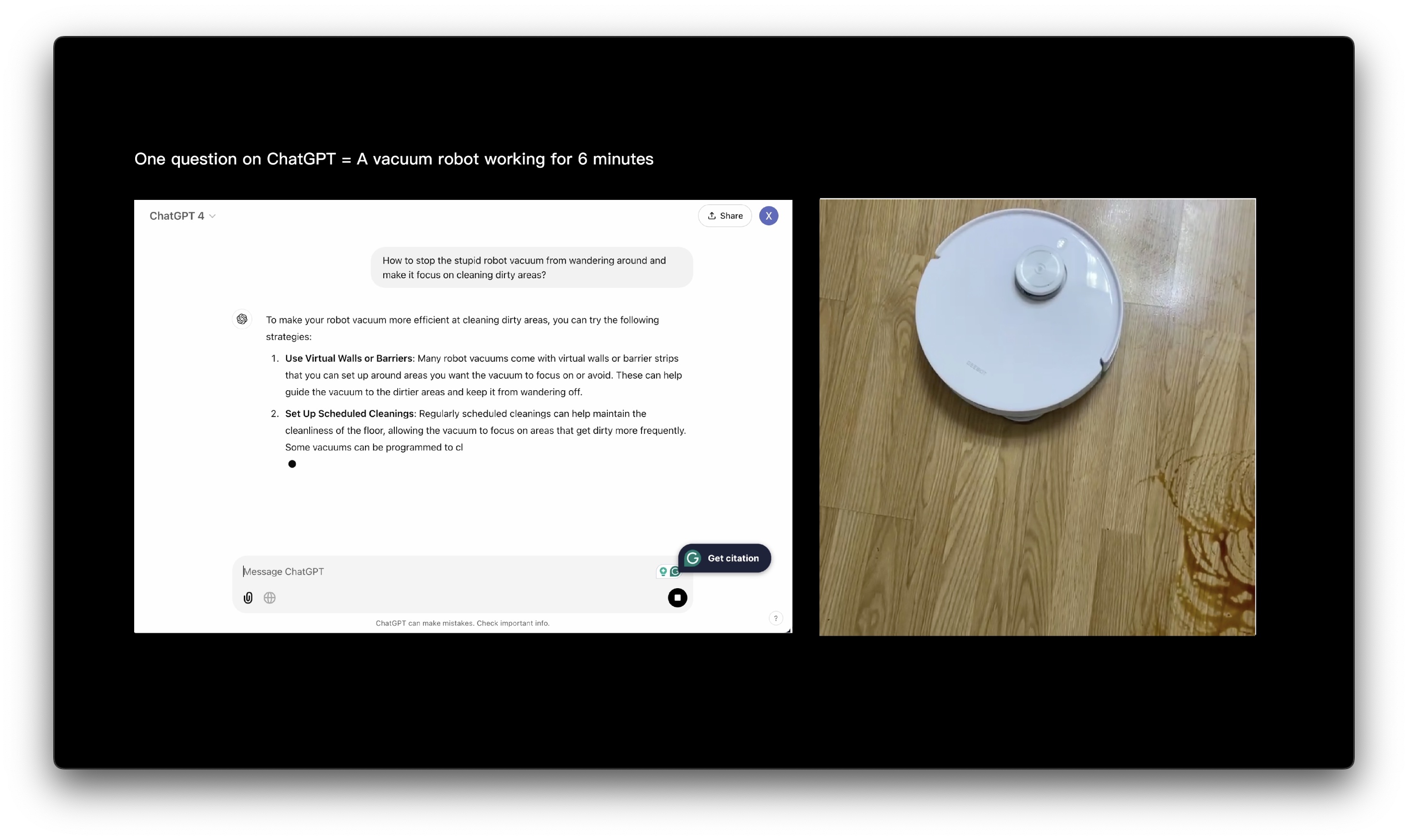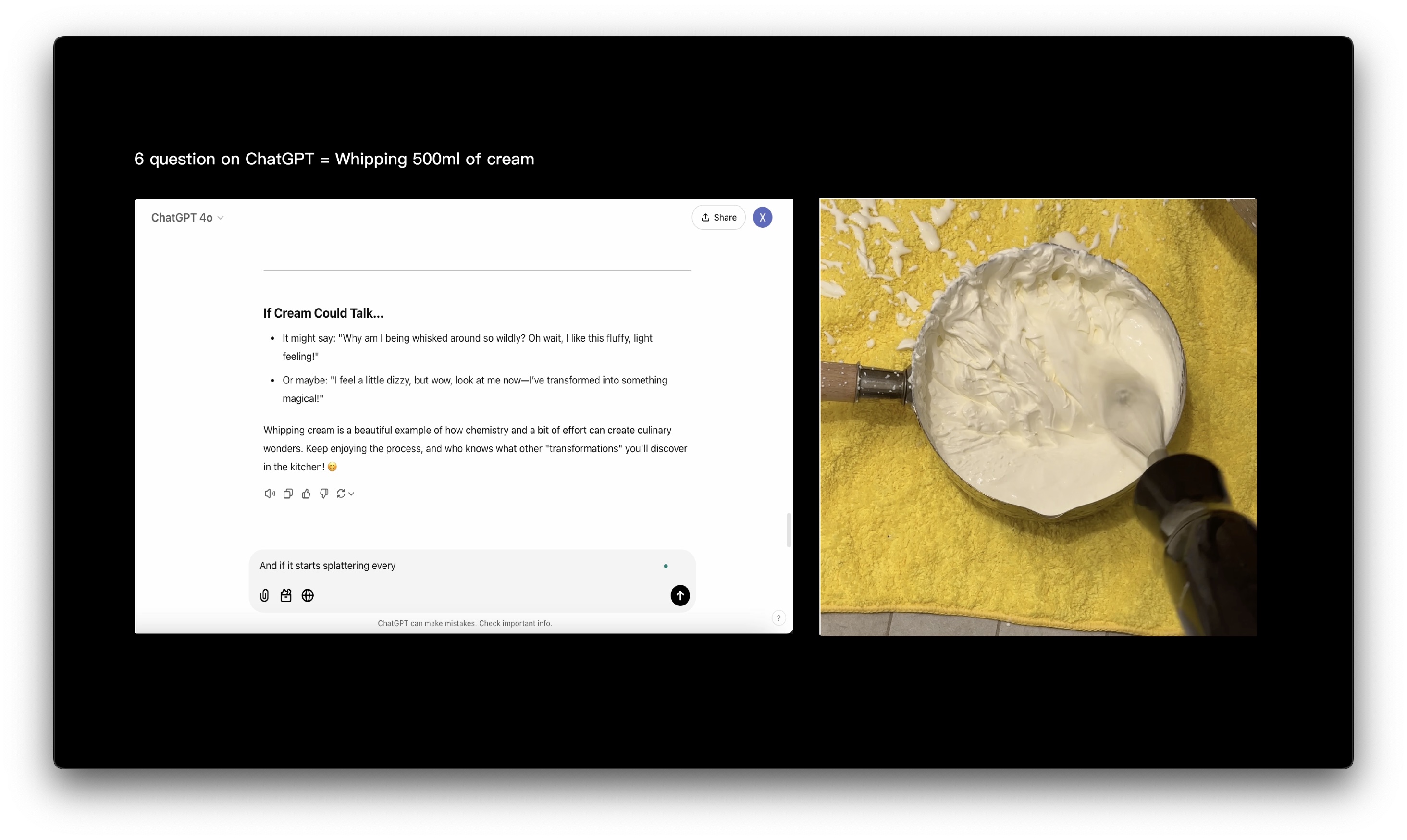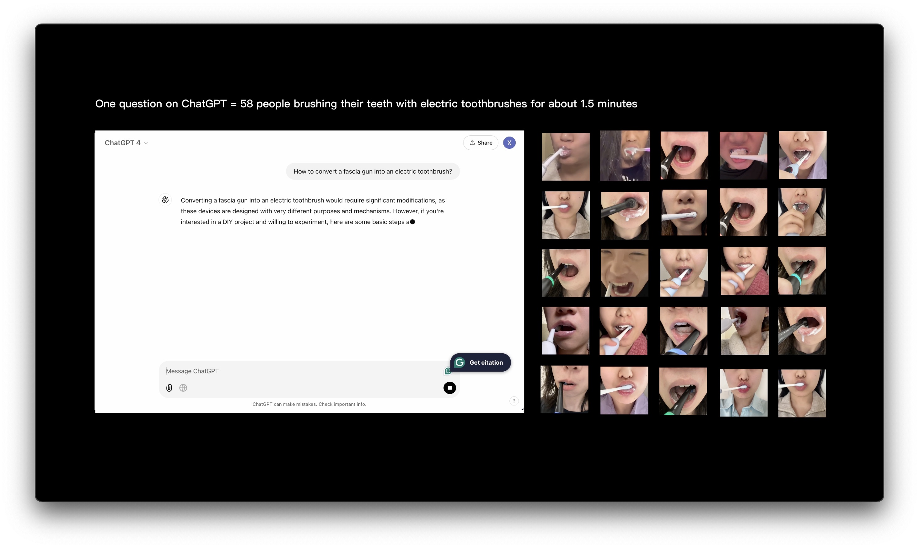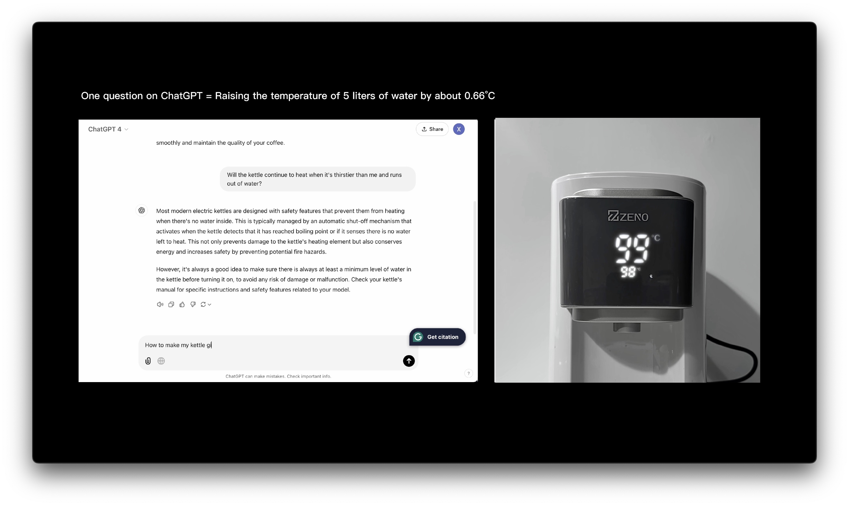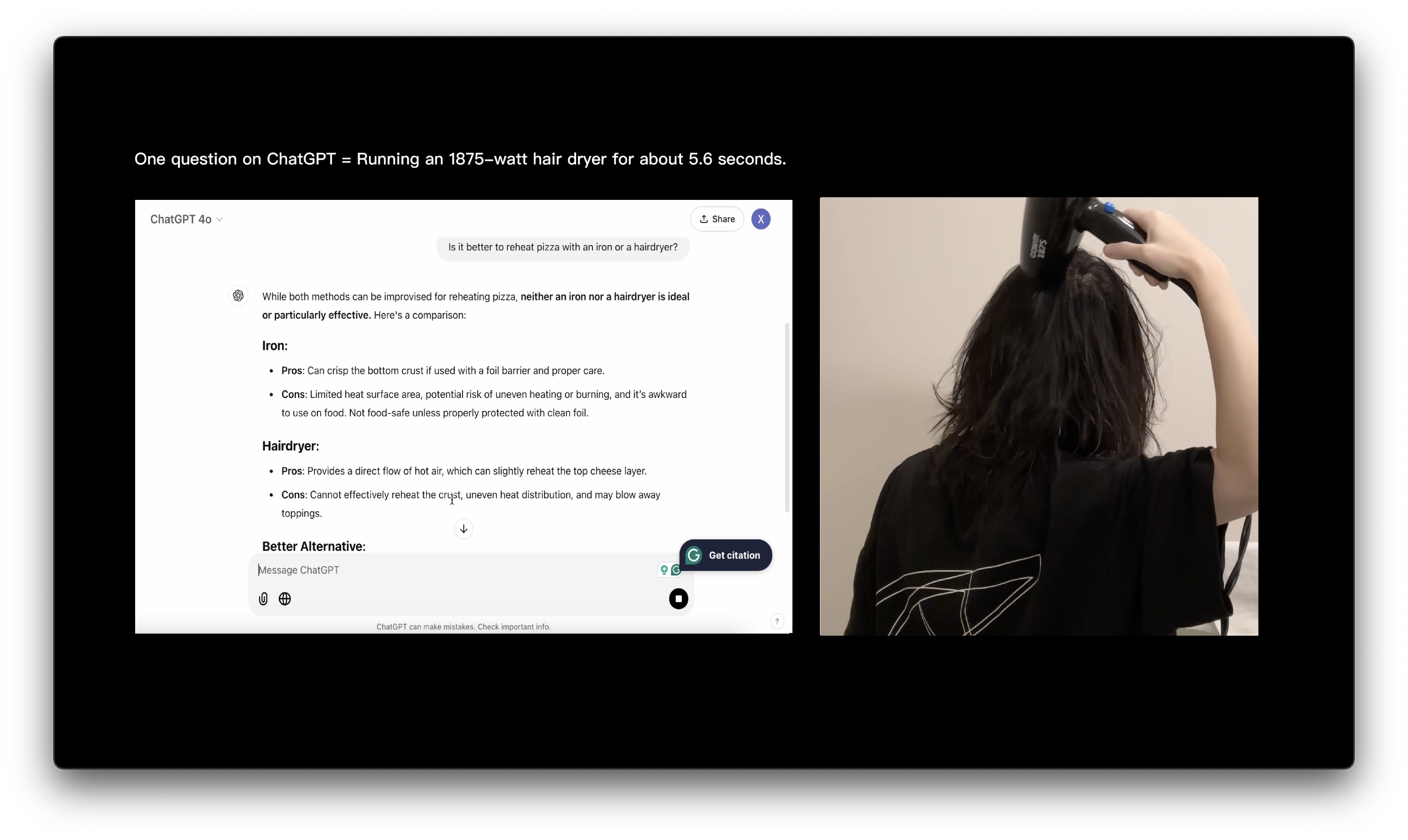 Description: This video exposes the hidden energy costs of AI. On the left, we see mundane or ridiculous prompts given to ChatGPT. On the right, the equivalent energy consumption is visualized through familiar daily acts.